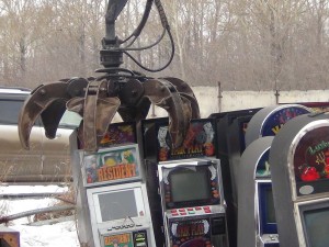 В Юрге по решению суда полицейские провели уничтожение игорного оборудования. Оно было изъято в ходе различных операций по ликвидации игровых клубов на территории города. 37 автоматов были вывезены на предприятие по утилизации металлолома. Здесь они попали в специальную прессовочную машину и в считанные минуты были уничтожены. «Однорукие бандиты» больше не принесут прибыли нелегальным бизнесменам, которые зарабатывали деньги за счет юргинцев.