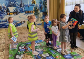 Госавтоинспектор провел с дошкольниками игру «Бродилка по ПДД», направленную на знакомство детей с правилами дорожного движения и привитие детям основ правил безопасного поведения на проезжей части.