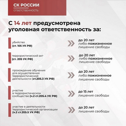 Следственный комитет в Кузбассе напоминает: за серьезные преступления против государства и общественной безопасности уголовная ответственность наступает с 14 и 16 лет.