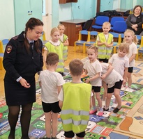 В игровой форме госавтоинспектор рассказал детям, на что следует обратить внимание при переходе проезжей части, где могут неожиданно появиться транспортные средства.